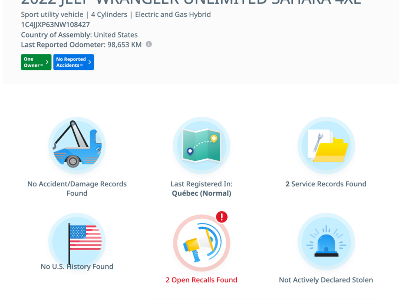 Jeep Wrangler Unlimited Sahara 4xe 2022 – Liberté électrisante sur quatre roues! Voici le Jeep Wrangler Unlimited Sahara 4xe 2022 en vert, affichant 98 653 km, conçu pour allier l’authentique ADN Wrangler et la modernité d’un hybride rechargeable. Sous le capot, un moteur 2.0 litres turbo combiné à la technologie hybride délivre 270 chevaux, associé à une boîte automatique à 8 rapports TorqueFlite et au système 4x4 Selec-Trac pour s’attaquer à tous les terrains avec assurance. L’habitacle propose des sièges en cuir, la climatisation automatique bi-zone à commande vocale, des garnitures métalliques, un toit rigide convertible et des marchepieds latéraux pour un style aussi fonctionnel que robuste. Côté divertissement et connectivité, profitez d’un écran tactile 8,4 pouces, du système audio Alpine 552W avec 9 haut-parleurs, Apple CarPlay, Android Auto, un point d’accès Wi-Fi, et la navigation intégrée avec commandes vocales. La sécurité est au rendez-vous avec la caméra de recul ParkView, les phares à DEL automatiques, l’assistance au freinage, le contrôle de vitesse en tout-terrain et les systèmes d’alerte de pression des pneus. Polyvalent, puissant et respectueux de l’environnement, ce Wrangler 4xe est prêt pour l’aventure… et il vous attend chez Joliette Volkswagen! Nous avons fait l'inspection complète, AUCUN INVESTISSEMENT À FAIRE car tout est fait, facture à l'appui. Nous offrons aussi le FINANCEMENT 1-2-3 ÈME CHANCE AU CRÉDIT. Chez Joliette Volkswagen nous acceptons toutes les marques en échange, Bateau, Motorisé, Motoneige et Roulotte... *** Chez JOLIETTE VOLKSWAGEN DIVISION OCCASION, Votre concessionnaire de LANAUDIERE À 30 MIN DE MONTRÉAL ; Notre Mission, faire de votre expérience d'achat de votre véhicule neuf ou d'occasion, l'endroit numéro 1 dans Lanaudière DEPUIS 25 ANS, VENEZ MAINTENANT NOUS RENCONTRER !!! Bien que nous ayons pris toutes les mesures raisonnables pour nous assurer de la précision des renseignements fournis, nous ne sommes pas responsables de toute erreur ou omission. Veuillez contre-vérifier les renseignements auprès d’un représentant.