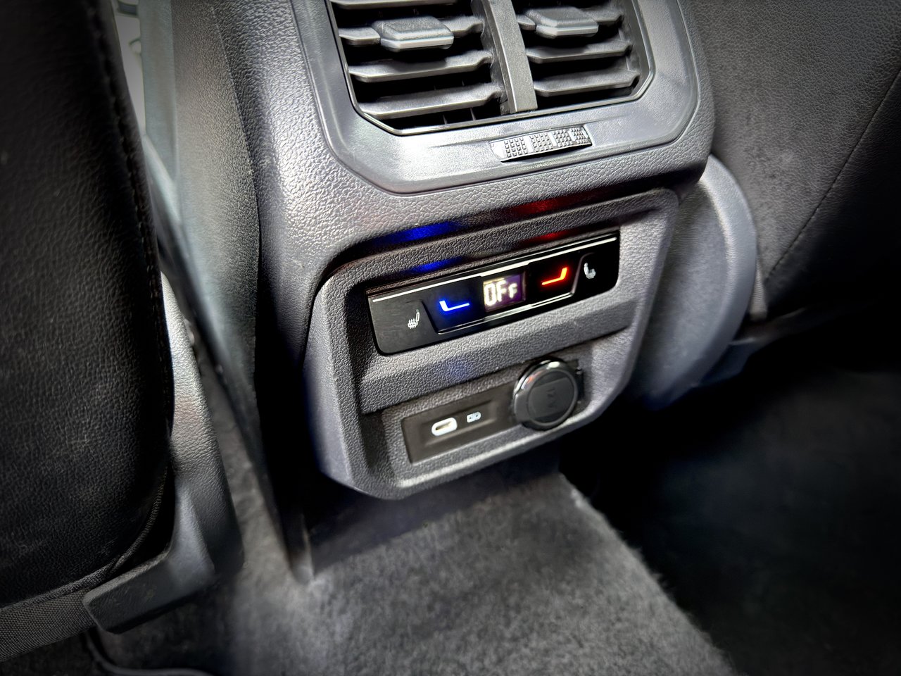 console au plancher pleine grandeur avec compartiment de rangement couvert, miniconsole au pavillon avec compartiment de rangement et 3 prises de courant de 12 v c.c.